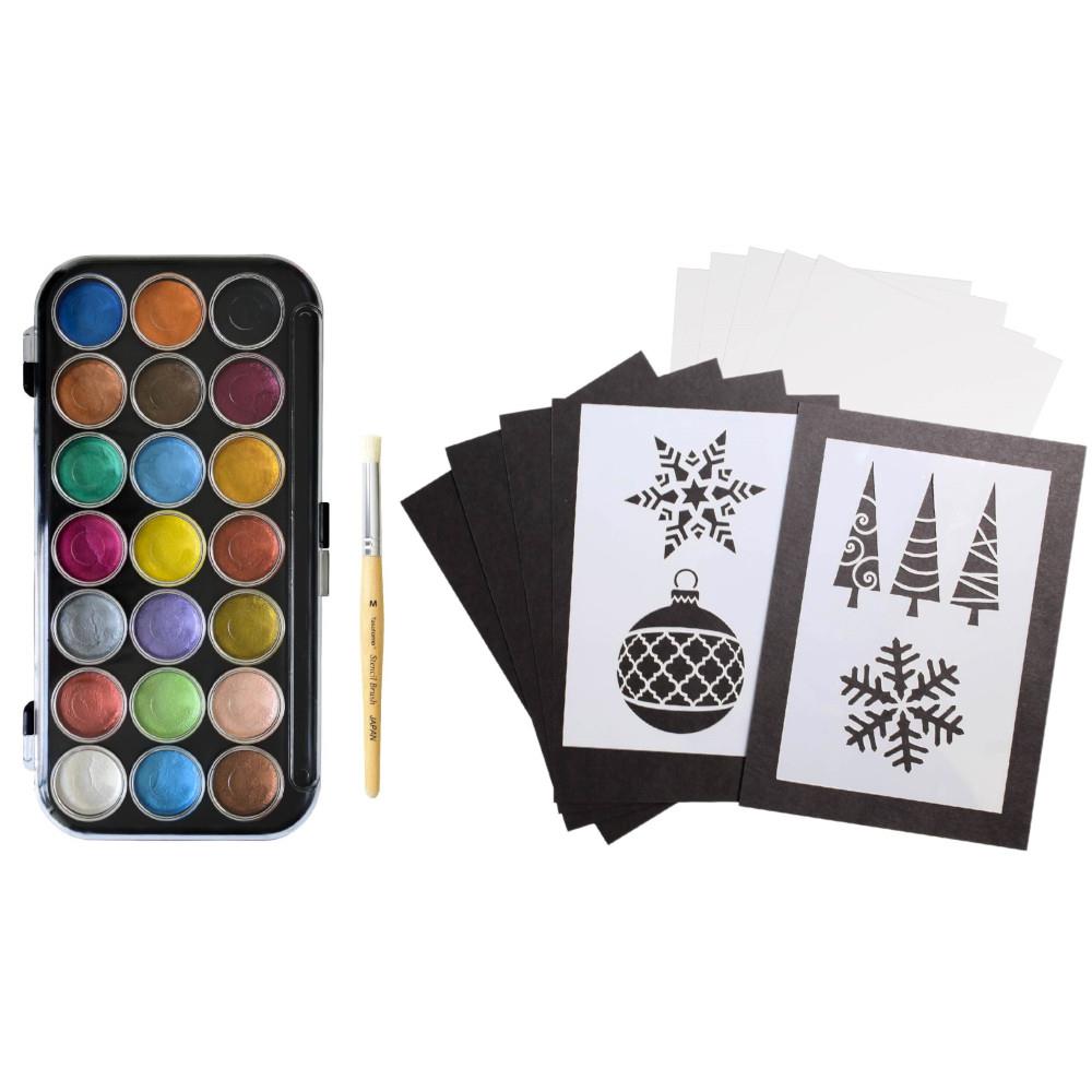 Winter Pearlescent Paint & Stencil Kit pearlescent paint and stencil kit includes everything needed to make shimmering card designs for winter.Kit includes:- 21 pearlescent watercolors (NPWC21)- 4 reusable and reversible stencil designs (star, ornament, holiday trees and snowflake)- 1 medium stencil brush from Kumano, Japan (JSBM)- 10 cards measuring 5" x 7" (5 black, 5 white)- Instructions- Easy to use and easy to clean up.
