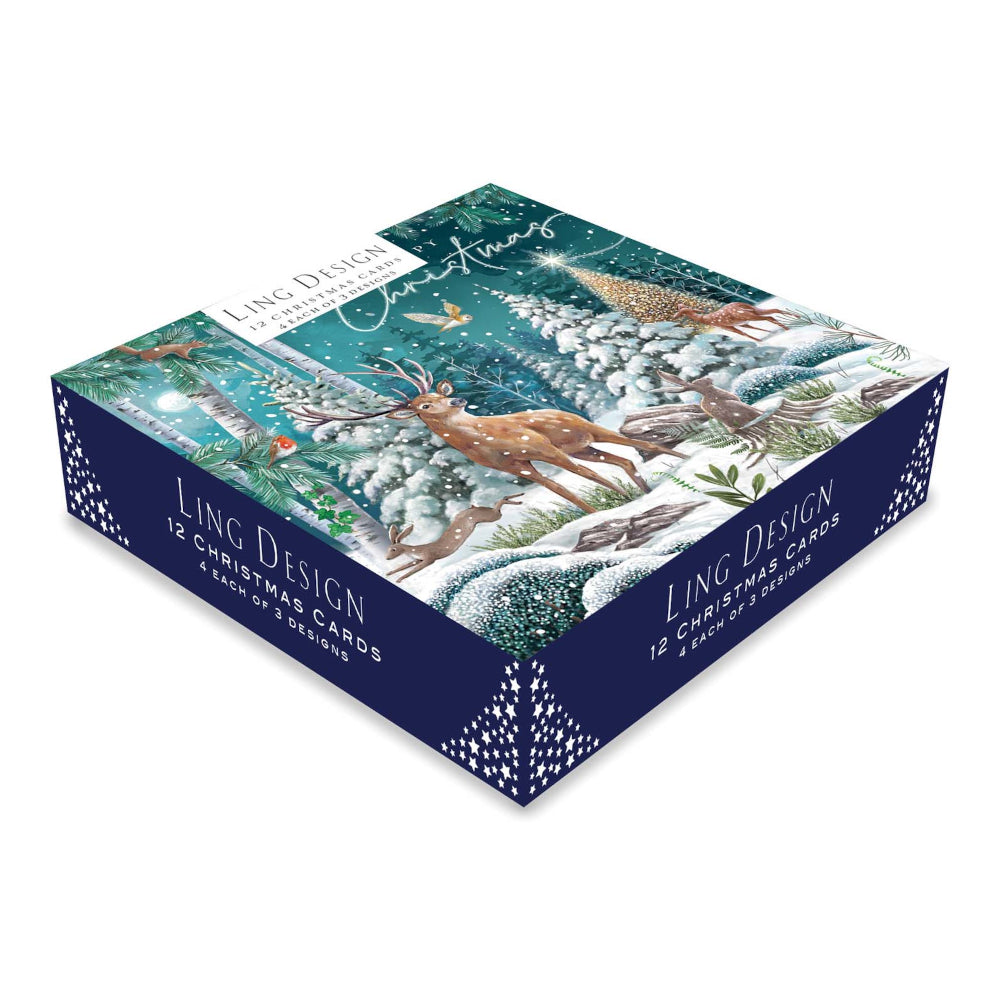 A magical woodland set of festive art in a deluxe box set of 12 Christmas cards featuring 3 designs. Add a touch of whimsical enchantment to your mailing list with these cards from Ling Designs!