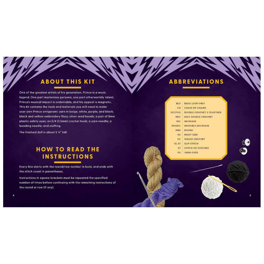 Crochet your own adorably flamboyant Prince doll, complete with guitar! This fun kit has all the instructions and materials you need.With a crochet instruction book that covers crochet basics and stitches, along with a Prince crochet pattern and the materials to make it, the Unofficial Prince Book and Crochet Kit has everything you need to make your very own amigurumi Prince doll. Styled with his signature purple trench, frilled shirt, and guitar, this mini rock-and-roll icon is surprisingly accurate, with details inspired by the rock megastar. Using the included instruction book, learn or review the crochet techniques used in the project. Next, follow along with the step-by-step pattern instructions and helpful how-to photos to create your mini Prince. The kit includes: