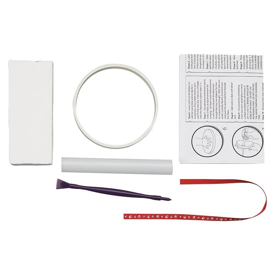 Make your own ornament with your pet's pawprint! This kit comes with all the materials you need to capture the puuuurfect impression, and becasue it is oven bake clay you can take you time to get the details just right before bakeing. Add your own flurish with other oven/heat safe polymer clays or with paint and adornments after baking.* Pet owners and pet family members will treasure this keepsake for years to come! This Kit comes with: 3oz (85g) oven-bake clay, roller, ribbon, detail/ sculpting tool, shapping ring, and instructions.Please note: always check the temperature and baking time of each polymer clay you are using, and follow all health and safety information. Additional clay colours, paints, adornments, etc. are not included in this kit.