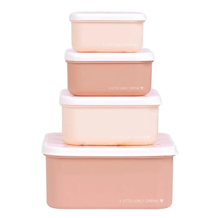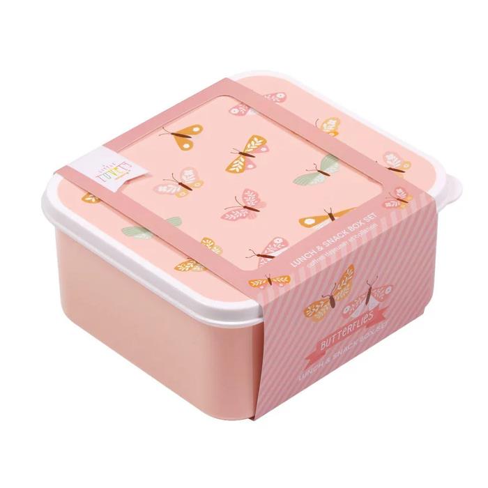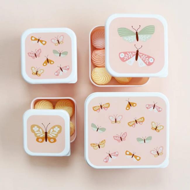 Set of four lunch and snack boxes in four different sizes and matching designs, featuring butterflies. The tabs on the side of the lids make them easy to open and close, and the boxes stack inside each other for convenient storage.