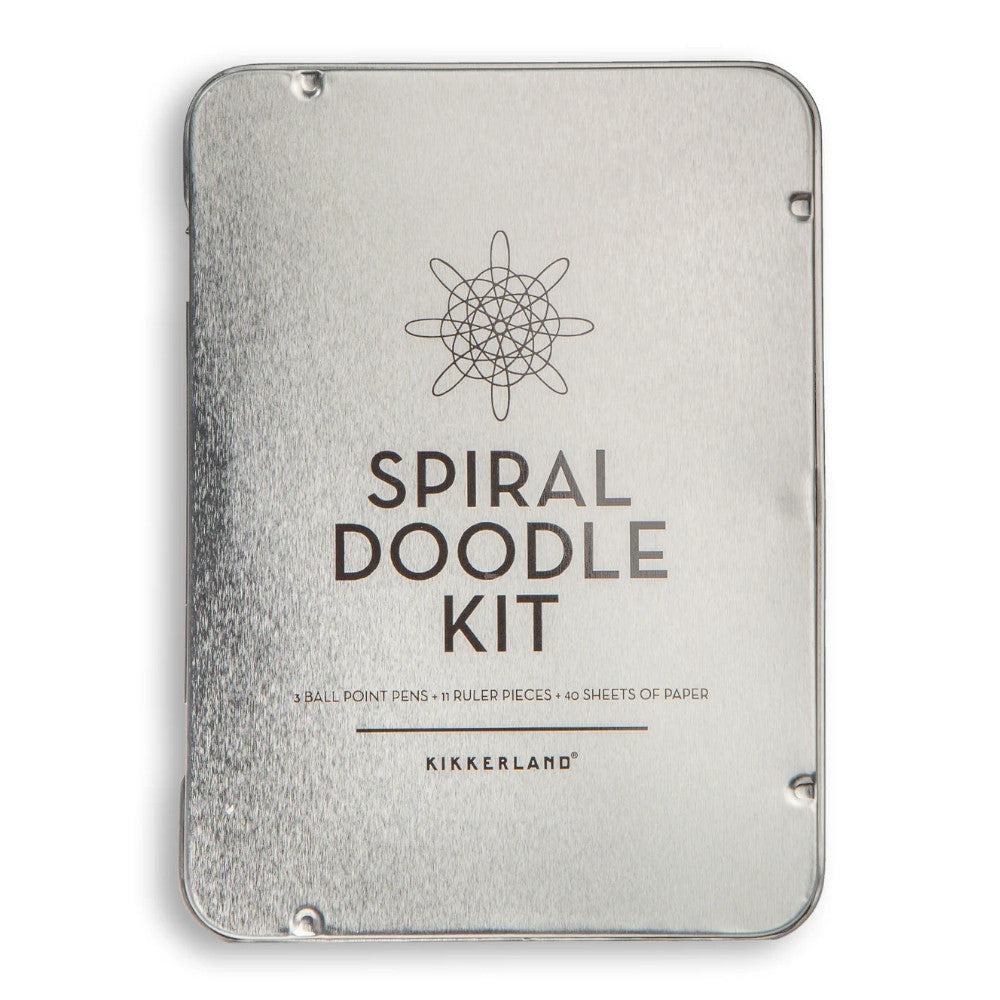 Create intricate designs with this compact spiral doodle kit. This mini spirograph art tool set includes 11 ruler drawing wheels, 3 ballpoint pens in blue, black and red, and a 40 page booklet, all inside a metal tin.