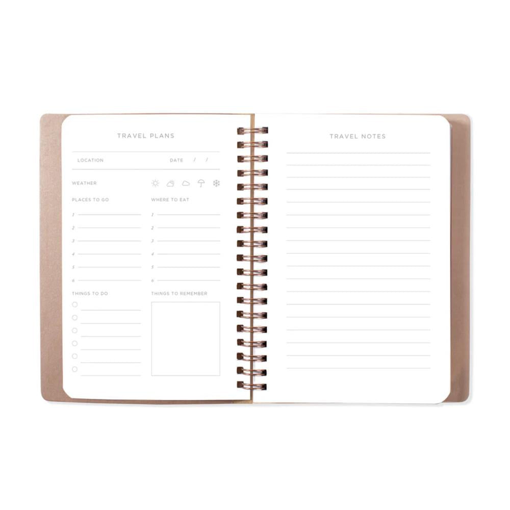 Travel book with faux leather cover featuring Fringe original artwork, metallic rose gold foil design, elastic cord closure, prompted interior travel planning pages with rose gold gilded edges, and semi-concealed twin-ring spiral binding.• 5" W x 6.875" H• Prompted interior travel planning pages• 160 pages• Rose gold gilded edges• Elastic cord closure