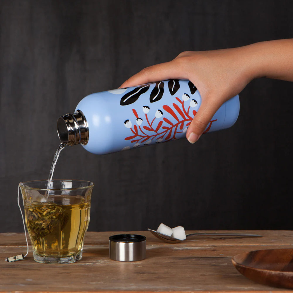 17-ounce reusable drink bottle for hot and cold beverages. A distinctive cylindrical shape and artist-rendered design that stand out from the rest