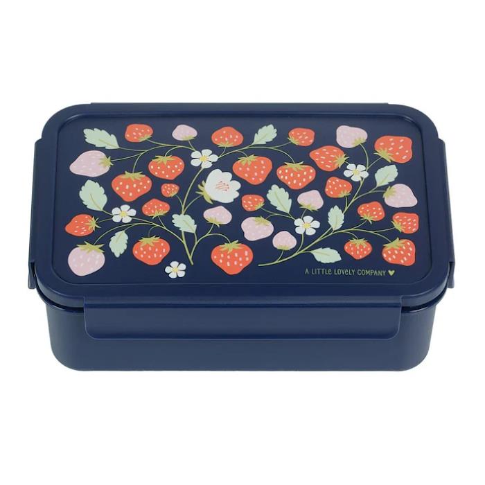 Spacious bento box with strawberry design. The airtight click & close lid and removable bento container with two compartments ensures a perfectly organized lunch. An ideal box for a fresh and varied lunch at school or on the road.
