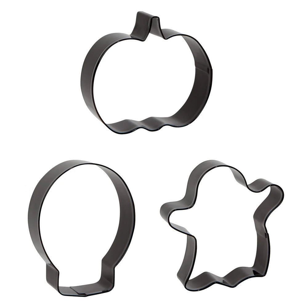 Stainless steel cookie cutter set with 3 assorted shapes comes ready-to-gift in delectable, printed cotton drawstring pouches. Includes pumpkin, ghost and skull forms.