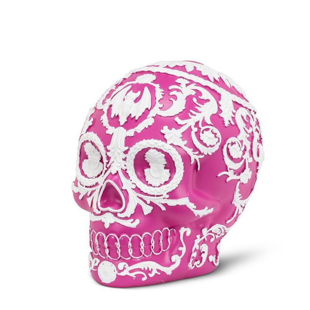 Celebrate the Day of Dead all year round with this striking Embossed Scroll Sugar Skull. Crafted out of resin, this pale-pink skull is accented with intricately embossed, raised filigrees for a captivating take on this often-frightening icon — perfect for adding some unexpected colour to your Halloween decor, or simply as an eye-catching decorative keepsake.