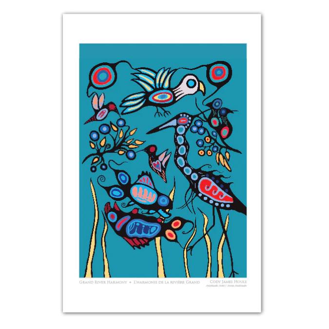 Designed by Anishinaabe artist, Cody Houle.Inspired by the Grand River in southern Ontario, an important place for me to go and decompress and view the beauty of nature that the creator has blessed us with.