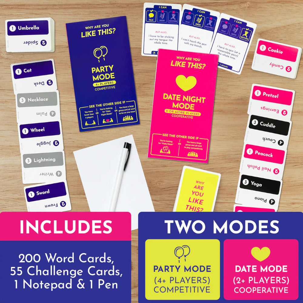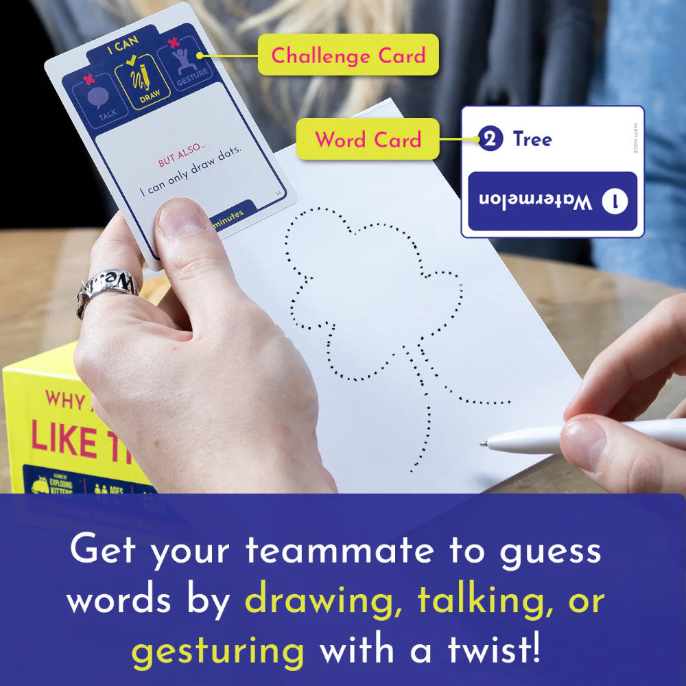 A card guessing game where you talk, draw, or gesture with needlessly weird restrictions. In this game, you’ll get a little playful, a little physical, and a little weird with your teammates.