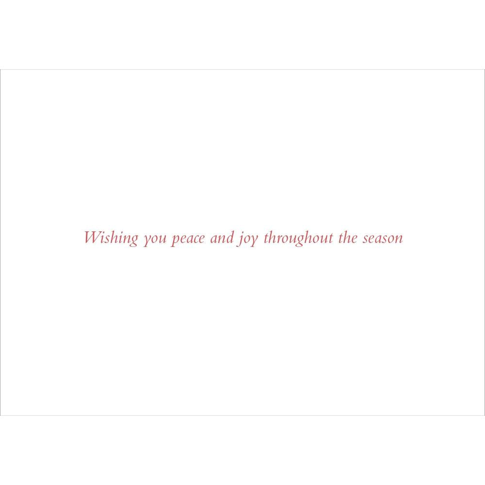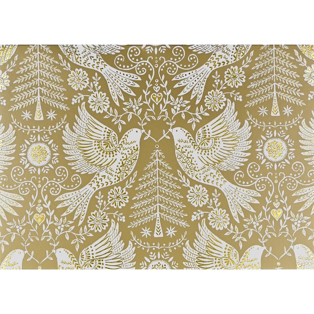 Radiant folk art-style greeting cards feature a repeating design that includes doves, hearts, and Christmas trees.