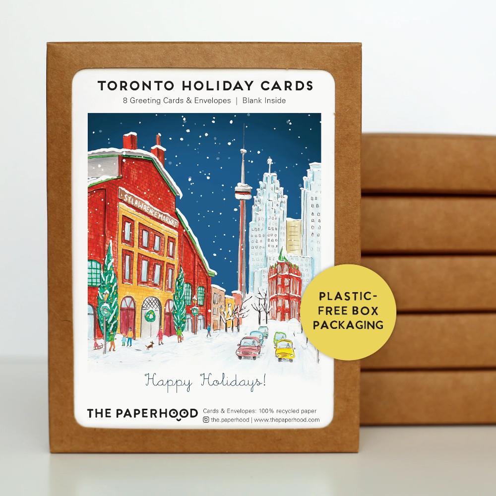Celebrate the holidays with this 8pk of greeting cards featuring an image of the iconic Toronto neighbourhood of St. Lawrence Market covered in snow and Christmas decorations.