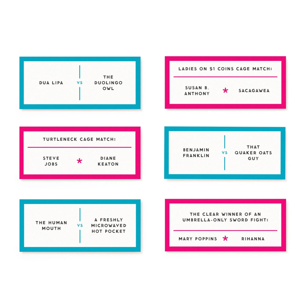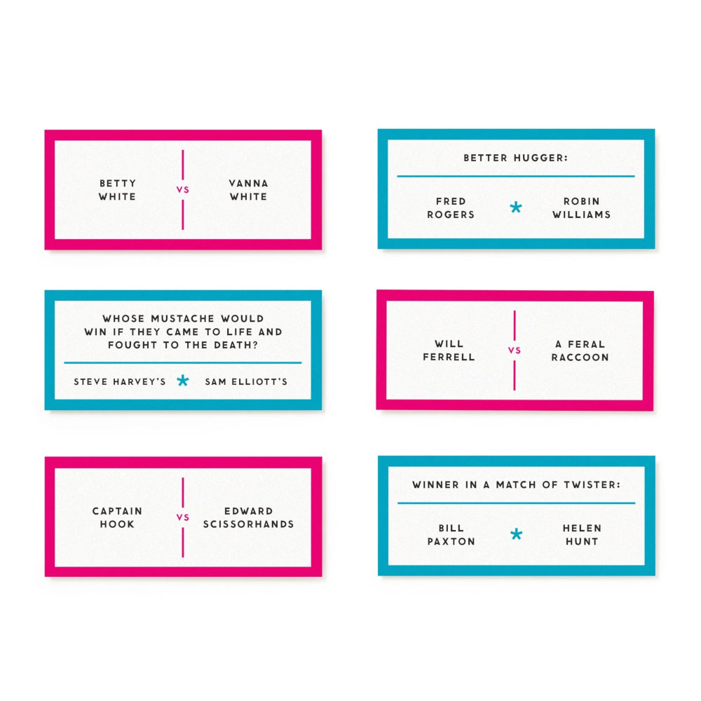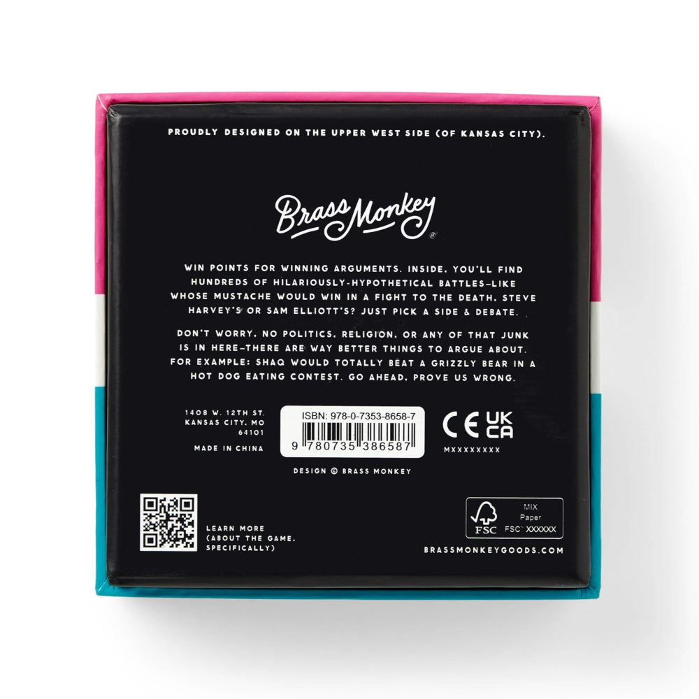 Win points for winning arguments. Inside, you’ll find hundreds of hilariously hypothetical battles–like whose mustache would win in a fight to the death, Steve Harvey's or Sam Elliott's? Just pick a side and debate. Suitable for 2 to 4 (or more) players. Includes 200 cards with different battles to play out.