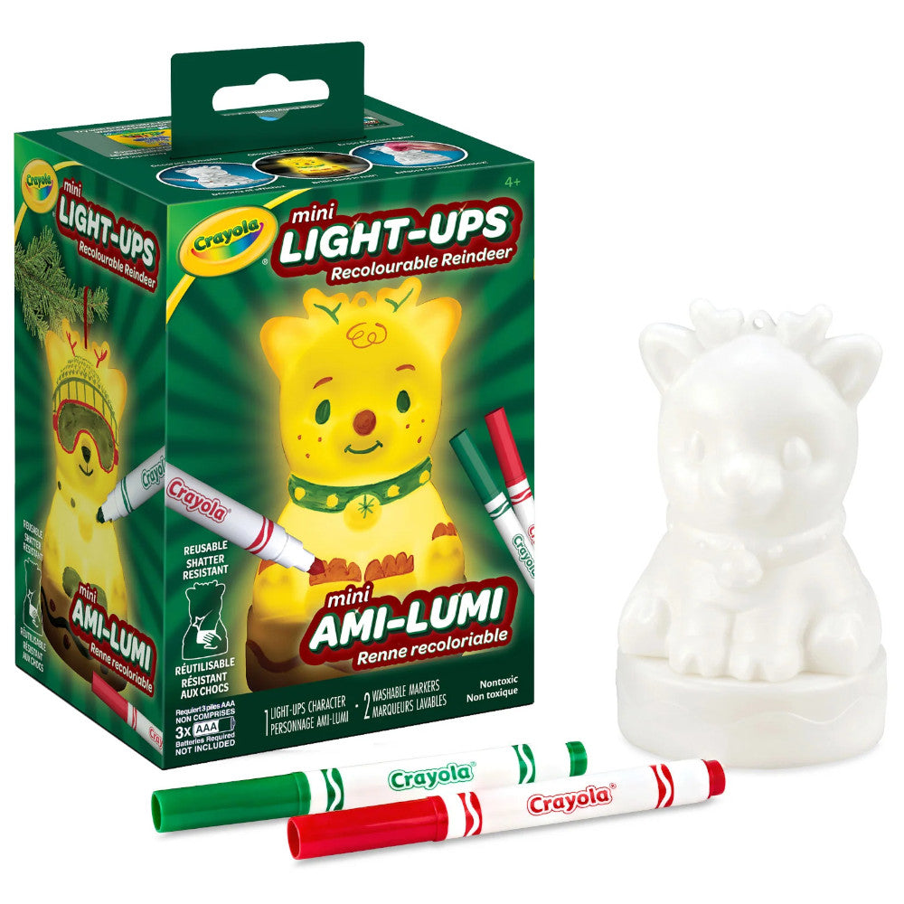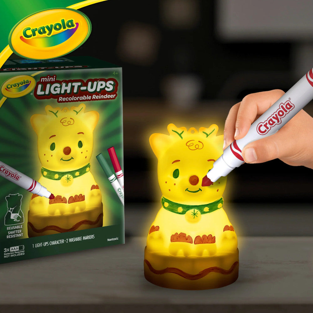 Light up the holiday season with the recolourable Light-Ups Mini Reindeer from Crayola! This all-in-one toy, holiday decoration, and reusable colouring activity, gives kids a new winter tradition to celebrate. First use the 2 Crayola Ultra Clean Washable Markers in Red and Emerald to colour directly on the included cuddly reindeer figure. Adorn your reindeer pal with original designs, or choose whatever look suits them best that day. You don’t have to worry about making mistakes or changing your mind, because it’s easy to erase your designs with a damp cloth and start again as many times as you choose. When your design is ready for display, let it glow in a warm orange light!