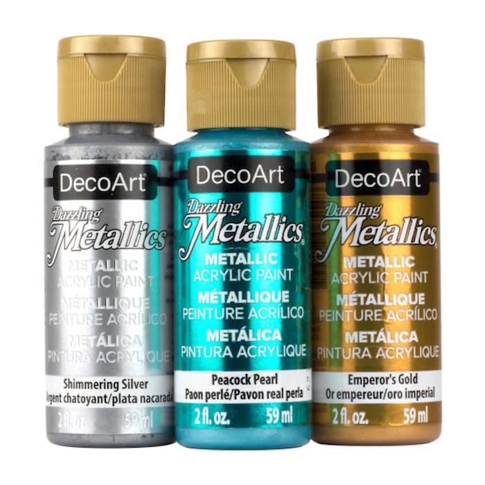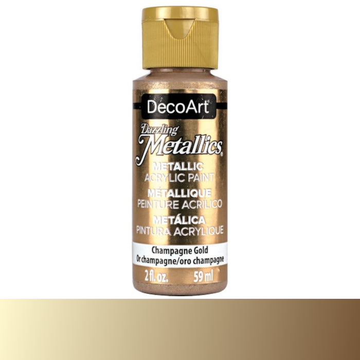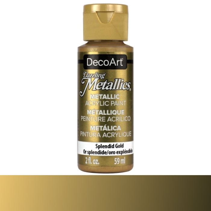 Dazzling Metallics are a premium, all-purpose, permanent metallic paint that adds an elegant shimmer to art, craft, and home decor projects. It's made with the brightest metallic flakes available and delivers excellent, opaque coverage. Select colors are also available in a writer and glaze.