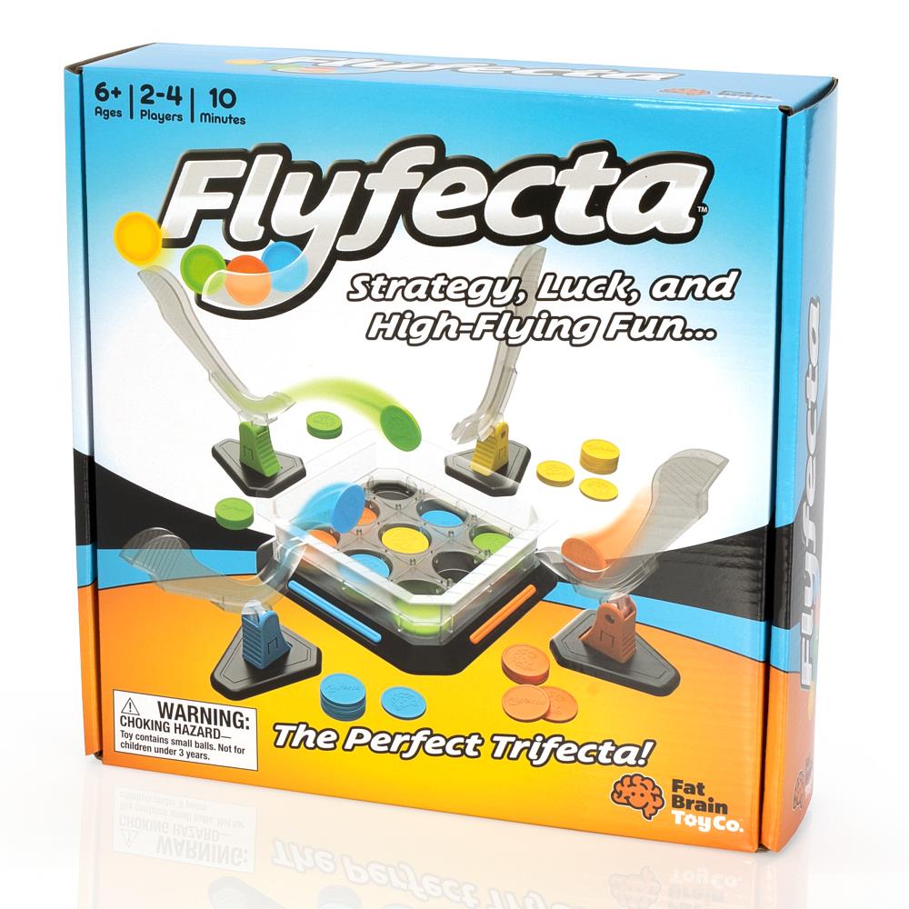 Aim, roll, launch, win! In this intense game of strategy, luck, and skill, players use the ramps to try and launch their discs into the slots of the gameboard. The first to get three in a row wins, but look out - another player can land one of their discs on top of yours and steal your victory! Experience the perfect trifecta of physics, luck, and fun with the thrilling, edge-of-your-seat game of FlyFecta!
