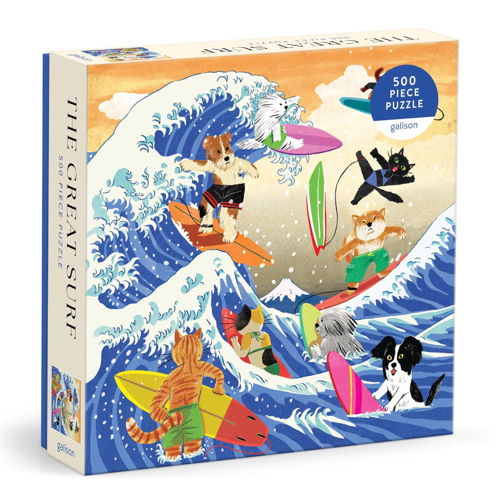 Dive into aquatic adventure with this 500-piece jigsaw puzzle by Yeji Yun celebrating the playful spirit of surfing animals. In this playful homage to The Great Wave by Japanese artist Katsushika Hokusai, the vibrant ocean scene captures adventurous cats and dogs riding, or attempting to ride, an impressive wave. Yun's energetic illustration style brings humor and charm to this whimsical composition, transforming a classic beach activity into a delightful celebration of courage and joy.