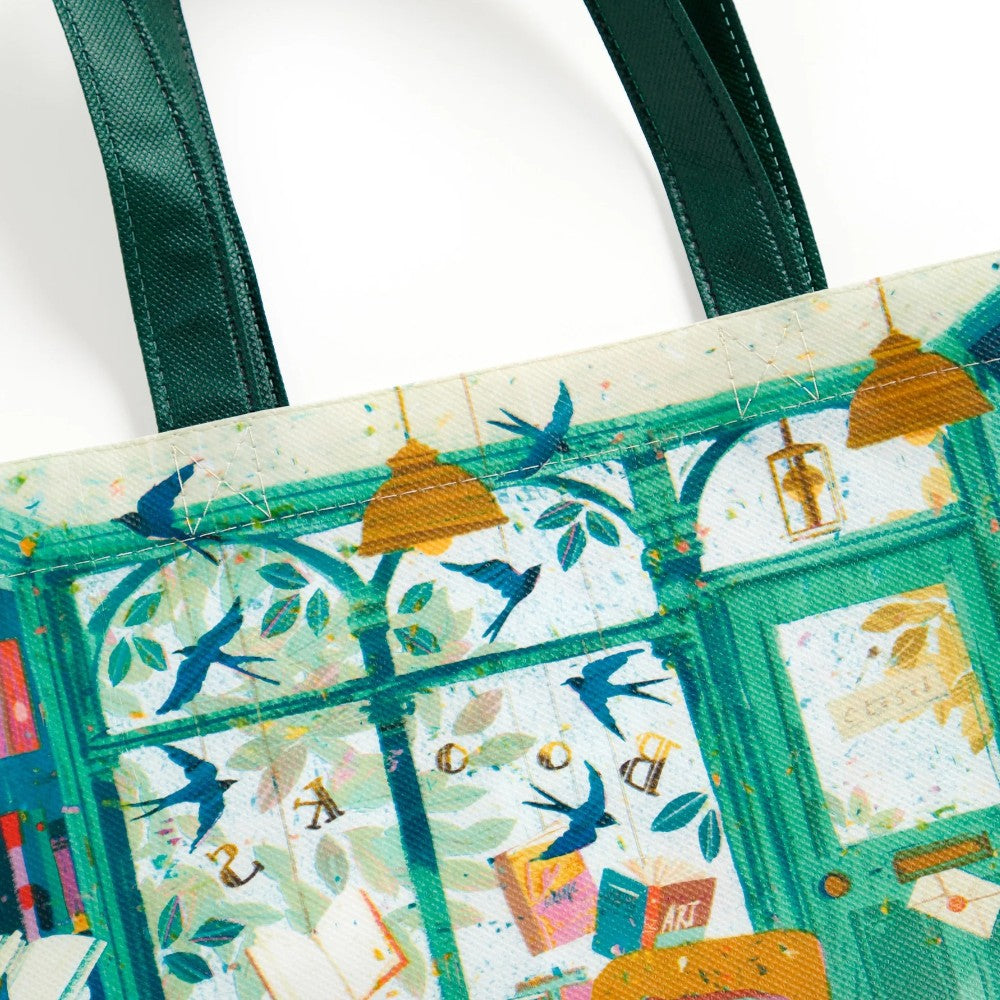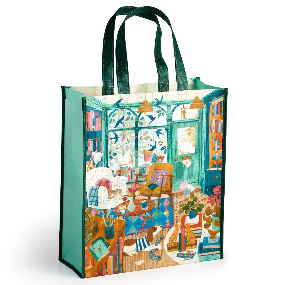 Carry your groceries and essentials in eco-friendly style with the Bookshop Afternoon Reusable Shopping Bag, featuring artwork by Victoria Ball. Lightweight and durable, this bag is crafted from eco-friendly materials, making it the perfect sustainable choice for your shopping trips and travels. Featuring charming artwork inspired by books, it adds a touch of whimsy to your errands. With ample space and sturdy handles, it's perfect for carrying groceries, books, or travel essentials. Say goodbye to single-use plastic bags and embrace sustainability with the Bookshop Afternoon Reusable Shopping Bag, your eco-conscious companion for every adventure.Size: 14.5 x 12.75 x 55" (369 x 324 x 140mm)Handle Length: 7.5" (191mm)Non-Woven (Recycled Plastic)Spot Clean Only, Do Not Wash