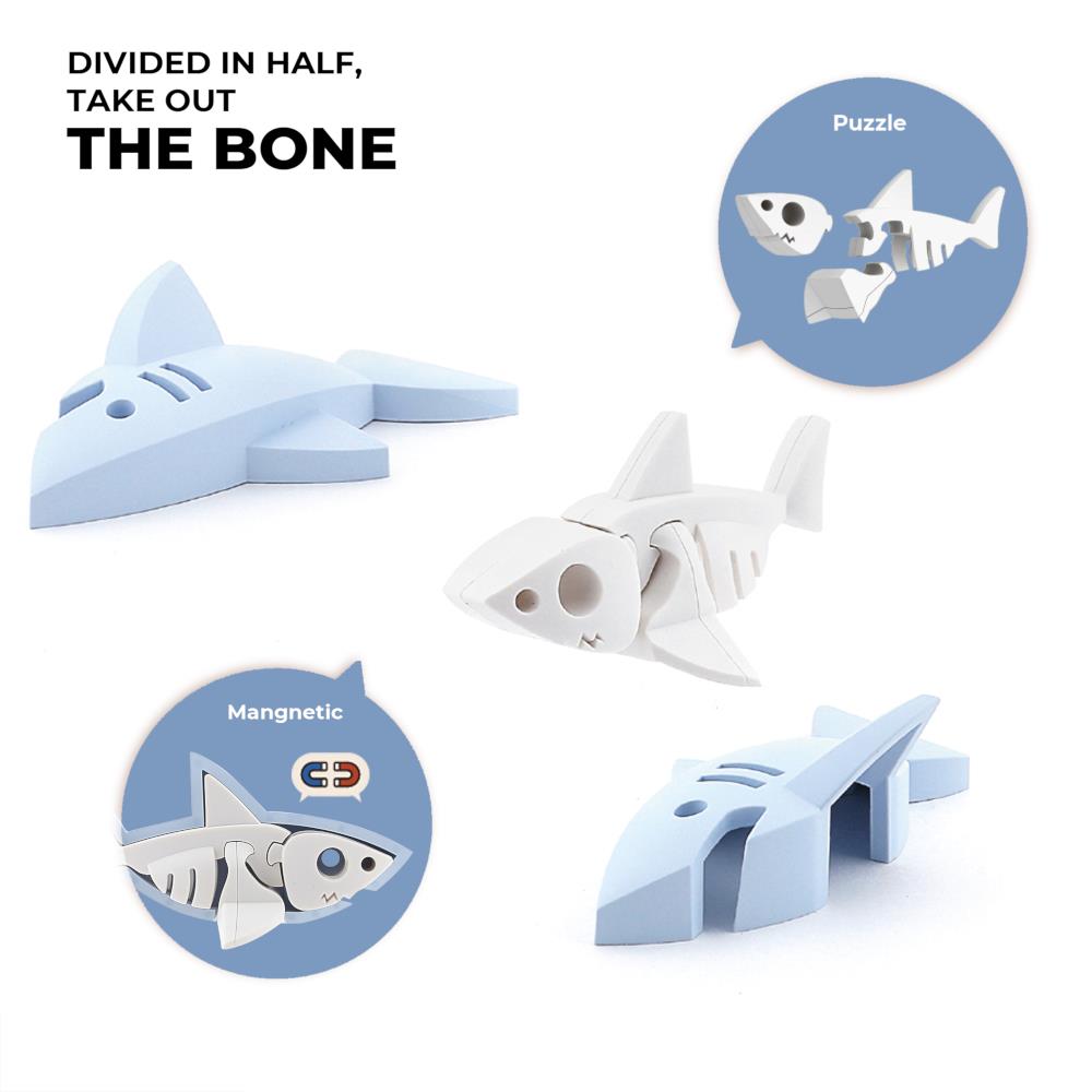 Introduce your little ones to the wonders of the sea kingdom with HALFTOYS White Shark, the perfect blend of fun and education toys for age 3+! These innovative toys simplify the appearance of living creatures while preserving their essential features with simple, smooth lines. With a magnetic outer shell that divides in half, young explorers can discover the inner workings of the White Shark, revealing its skeleton made up of several smaller bones. Assemble the 4-piece bone puzzle to learn about the Shark's anatomy while having a blast!Each toy comes with a diorama that can be connected to other dioramas in the HALF ANIMAL collection, allowing kids to build their very own scenic marine world. Let your child's imagination run wild as they explore and create, all while discovering the joy of building with HALFTOYS!