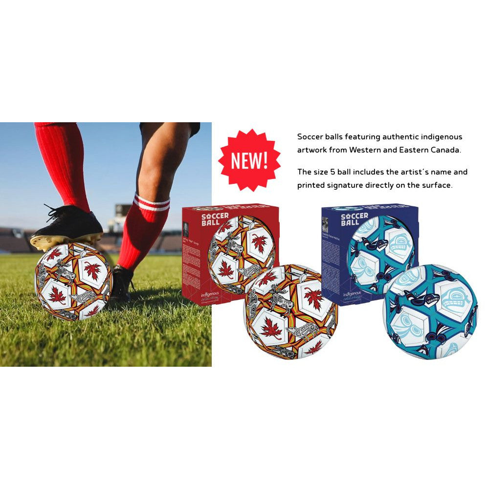 Soccer balls featuring authentic indigenous artwork from Eastern Canada by artist Jeffrey "Red" George - Ojibway. This design features red maple leaves and animals.