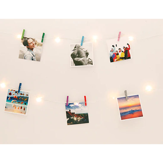 The mini clothespin string lights light up your home while showcasing photos, art and more!