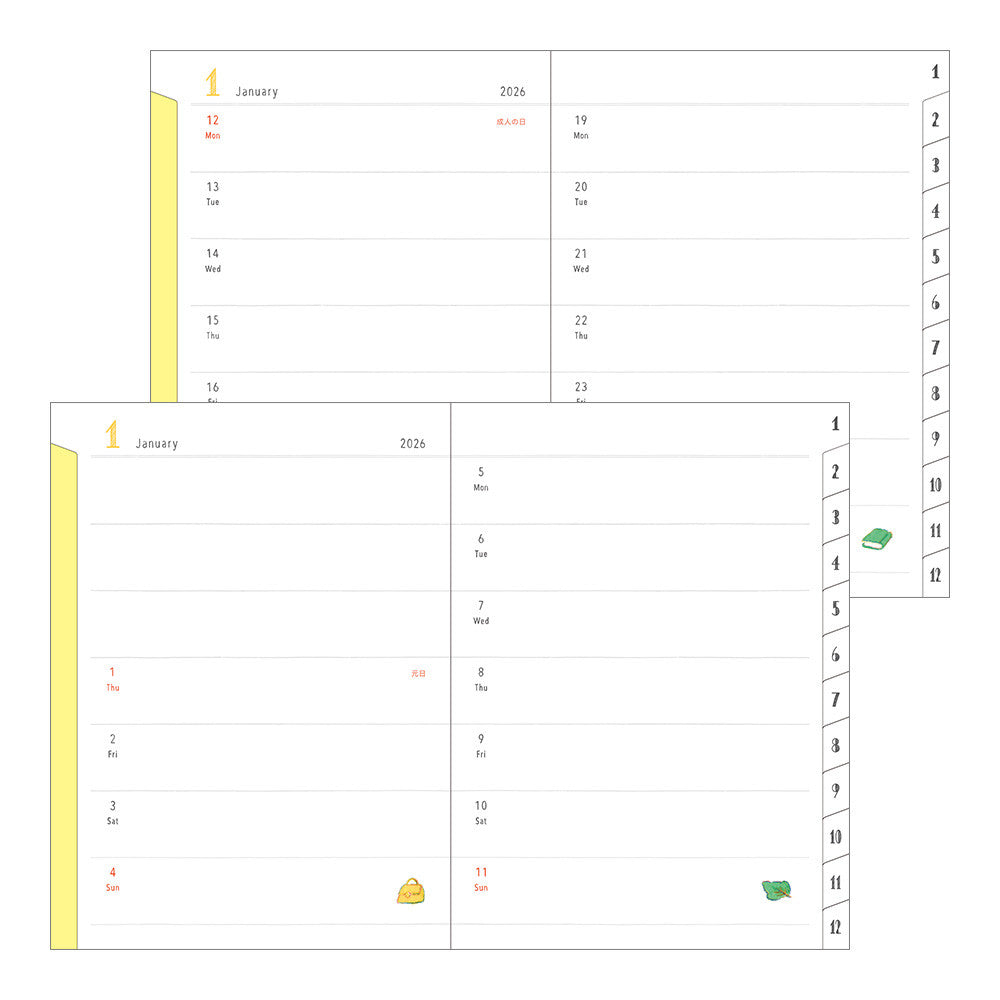 A planner about the size of a postcard, with plenty of space to write your schedule. It comes with handy index tabs. After each month’s “monthly block” pages, there is a two-page spread for a two-week schedule. The memo pages include a “My Memories” section where you can record events and impressions from the year.