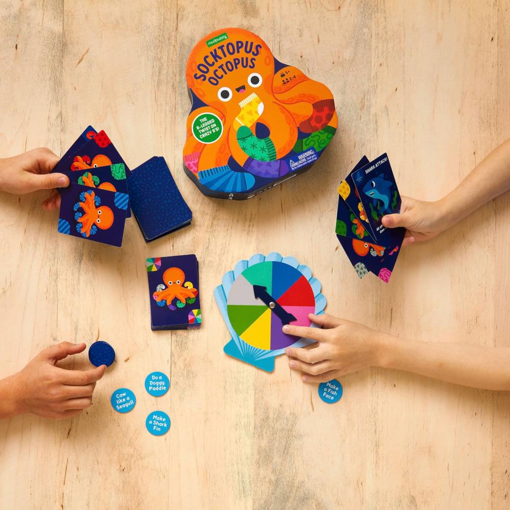 The Socktopus Octopus Shaped Box Game from Mudpuppy is an 8-legged twist on crazy 8’s! Match the socktopus cards by color or pattern, but don’t forget the silly actions. Perfect for family game night!