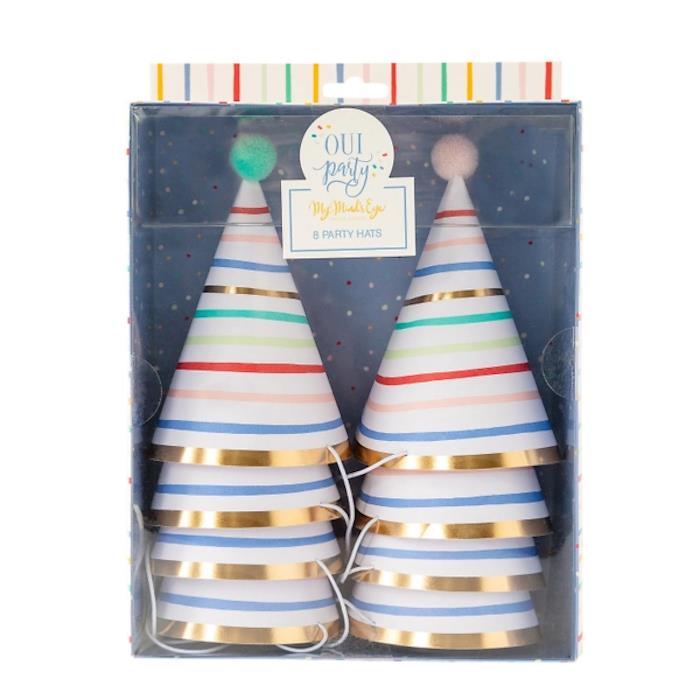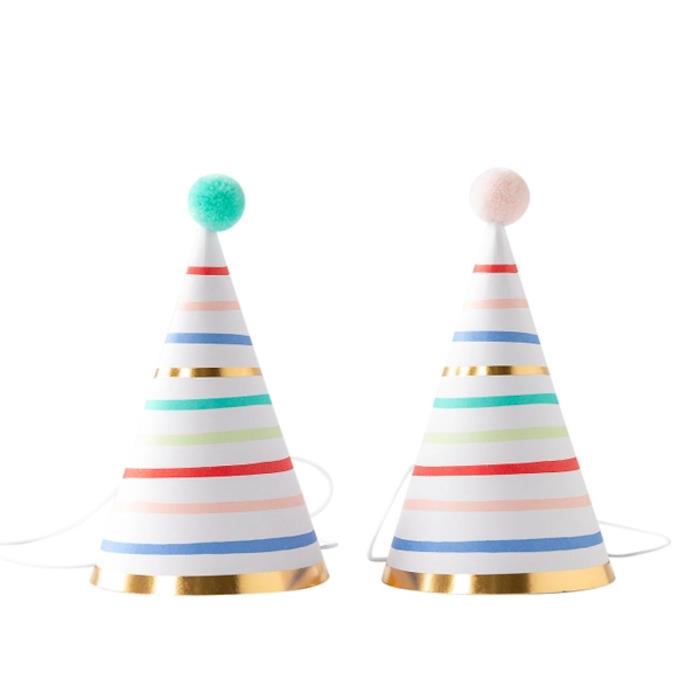 Get into the birthday spirit with these bright and cheerful party hats. From a little one's birthday bash to a grown up surprise party your guest will be delighted to party in these whimsical hats. And with a dash of gold foil they add just the right amount of sparkle to the day!