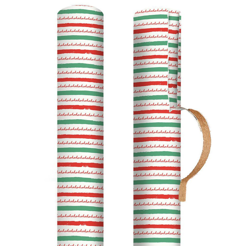 Cheerful holiday gift wrapping paper featuring a festive candy-cane striped design in red and green with ho ho ho text in between,