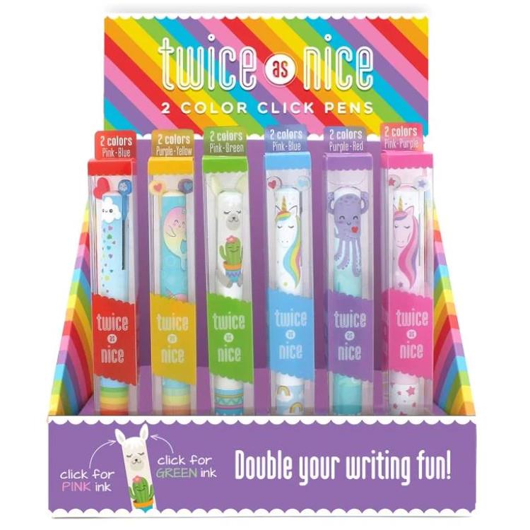 Double your writing fun with 2 color click pens with super fun pen designs! Each pen writes in 2 different color inks, just click the ears and arms to release the colors!