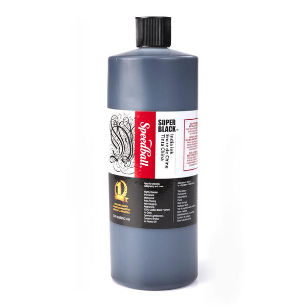 Made from highly opaque, carbon black pigment, this ink offers excellent reproduction quality on absorbent surfaces with optimum lightfastness. Easily applied by pen, brush, steel brush or airbrush, Speedball’s India Ink is free-flowing, non-clogging and waterproof.