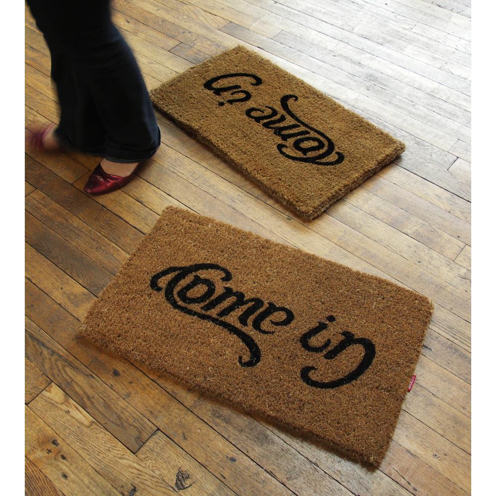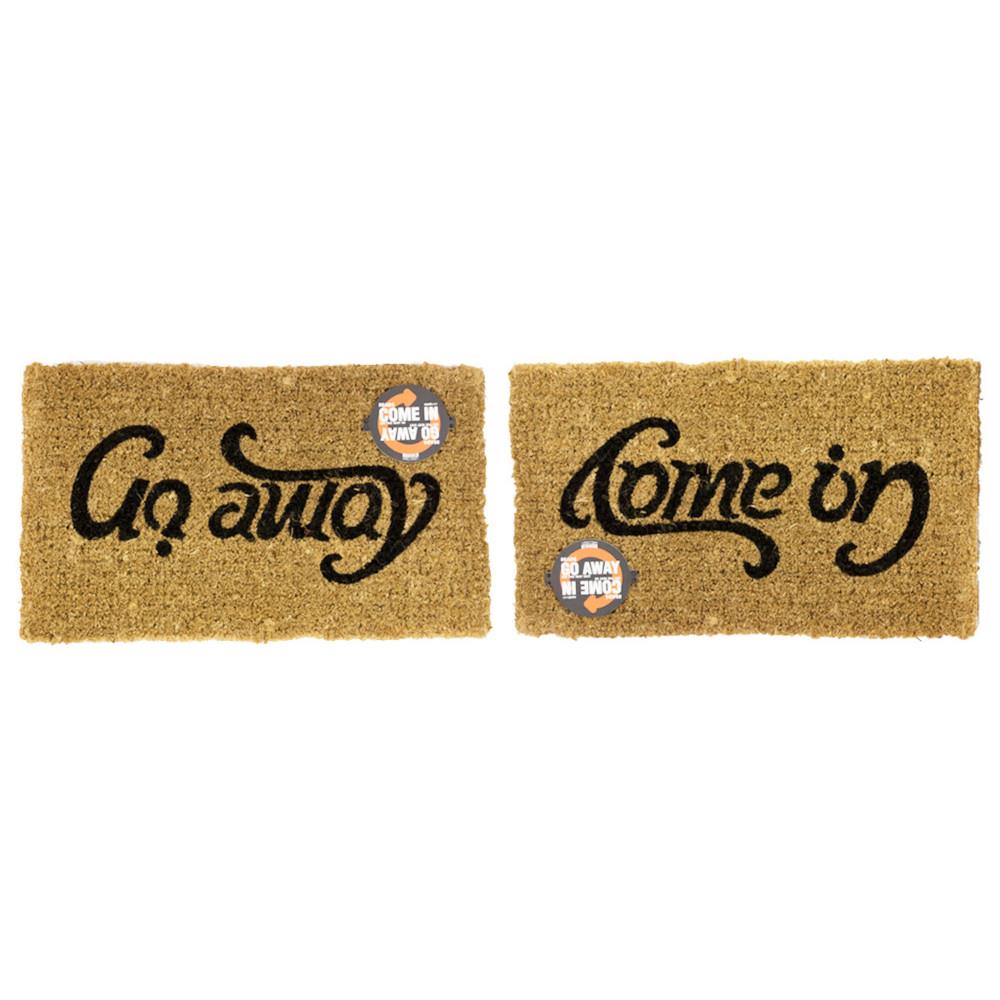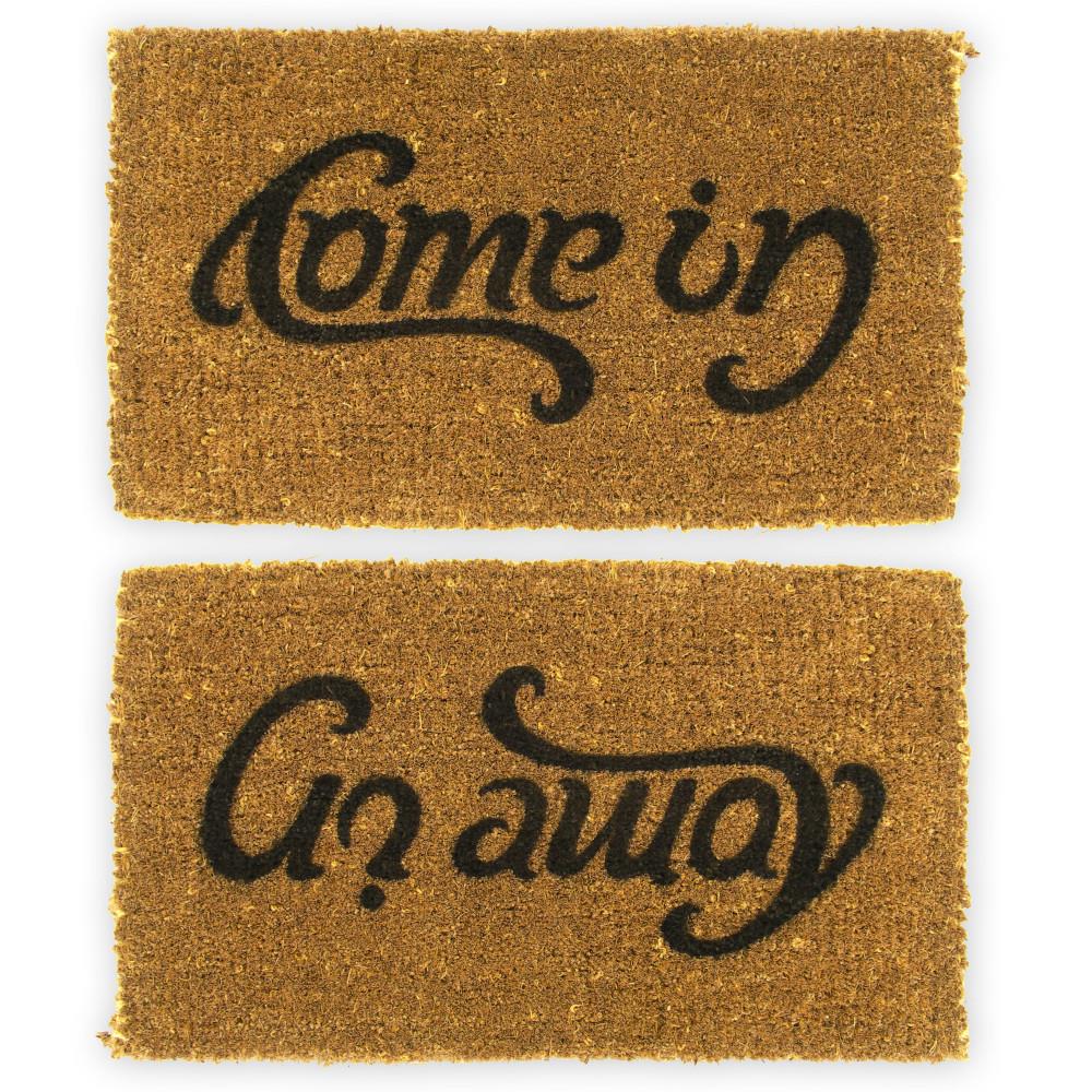A doormat with two different messages. Ambigrams read 2 different things when the writing is viewed upside down. This clever graphic uses a playful ambigram to greet and dismiss your visiting guests: "Come in" on arrival "Go away" when leaving. You can also use it to let visitors know whether you're welcoming guests or not at any given time by turning it around to make the message match your mood.