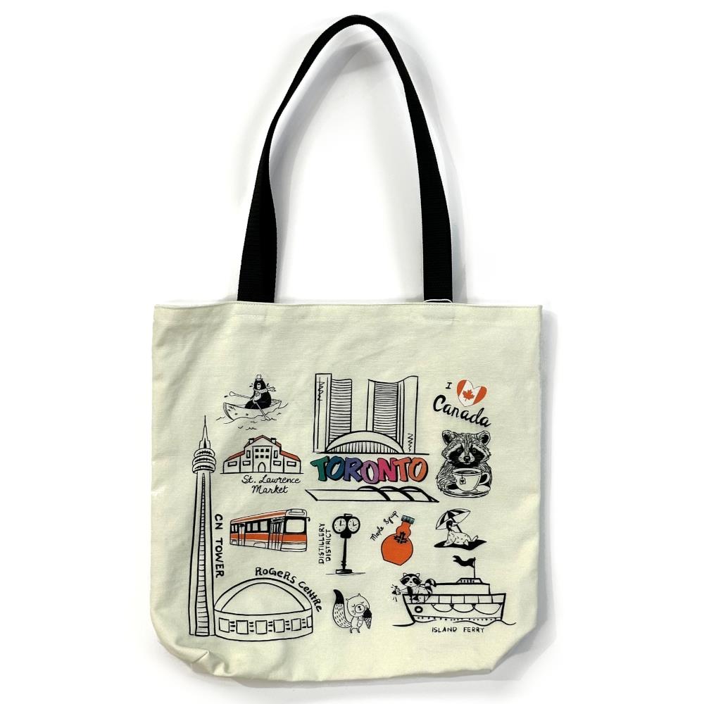 For all those times when you just need a little more, the Market Tote has your back! This perfect sized tote bag is the essence of functional fashion. Made with Heavy Cotton Canvas digitally printed with fun illustrations of Toronto icons.