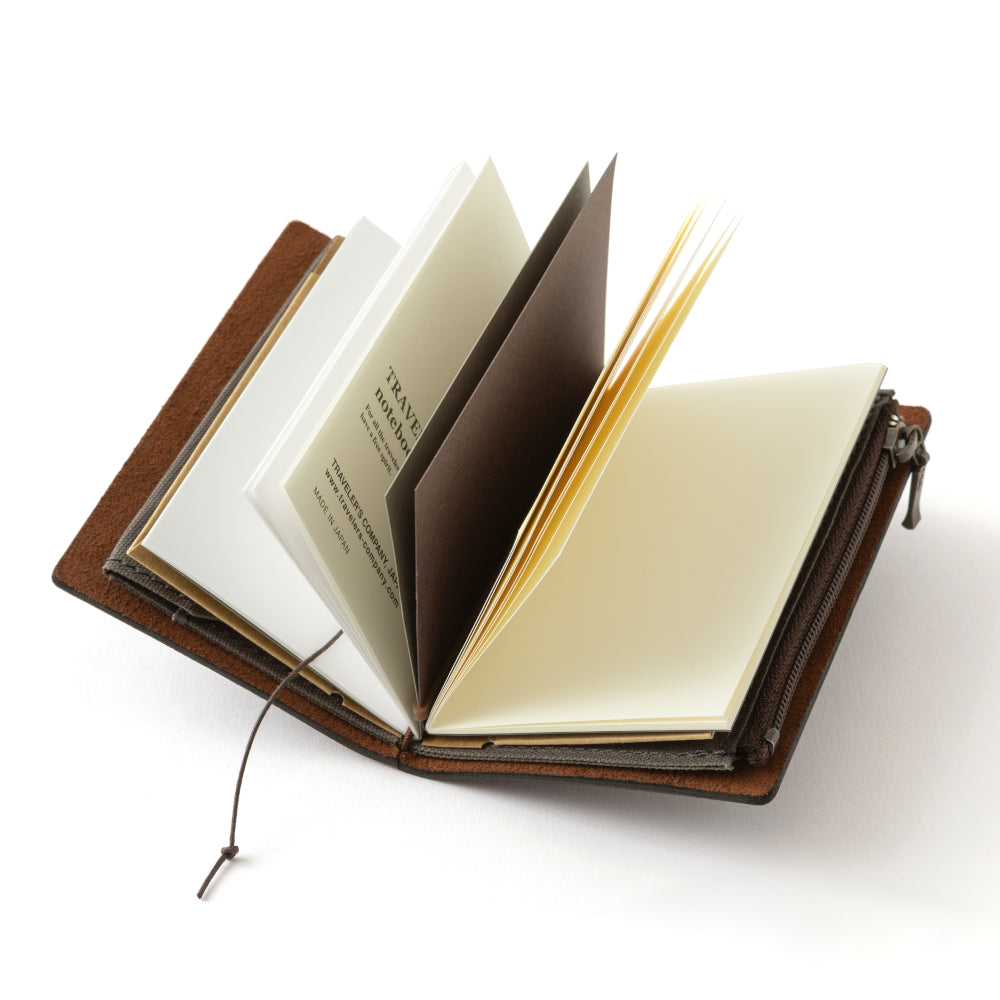 To commemorate this 20th anniversary, they’ve created a new size of TRAVELER'S notebook. It is TRAVELER'S notebook Card Size. This TRAVELER'S notebook is a convenient companion to take with you anywhere in your daily life. Whether it’s a sudden idea, information you learned or overheard, or something important you don’t want to forget--whenever and wherever you feel like writing, you can quickly grab the notebook and jot it down. The paper takes ink beautifully, so for those who love their fountain pens, this journal will not disappoint. This TRAVELER'S Notebook will be your daily companion for many years to come. This luxurious handmade leather journal set includes TRAVELER'S notebook Card Size, Refill Notebooks, Cotton Zipper Case, Kraft Paper Folder, and Connecting Rubber Band. By setting these into the real leather cover, you can use it as a compact wallet, a business card holder, a card case, or a mini-sized pouch. Keep your essentials together and carry them with your notebook. The moment you hold TRAVELER'S notebook, you become a traveller. Keep the Card Size with you always and live each day as if you were travelling.