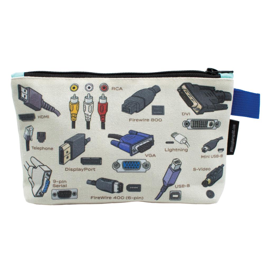 Whether you grew up with a pager and a Walkman - or a Palm Pilot and a 32MB MP3 player - or your phone is all you'll ever need - the Cables & Ports Zipper Bag will help keep your tech together. These 28 beautiful connections just might make you nostalgic... You never forget your first dongle.This zipper bag is a 5” x 9” fully-lined pouch with an inner card pocket and a 2” gusset – so it stands at the ready near your 1993 Compaq Presario