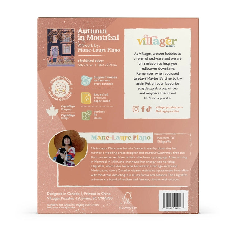 Autumn in Montreal is a magical time in this picturesque city. Stroll the boulevard row homes as the leaves change colours. Enjoy the charm and joie de vivre of Montreal while piecing together this beautifully-illustrated puzzle designed by talented Montreal artist , Marie-Laure Plano of Liligraffit.