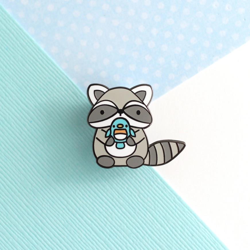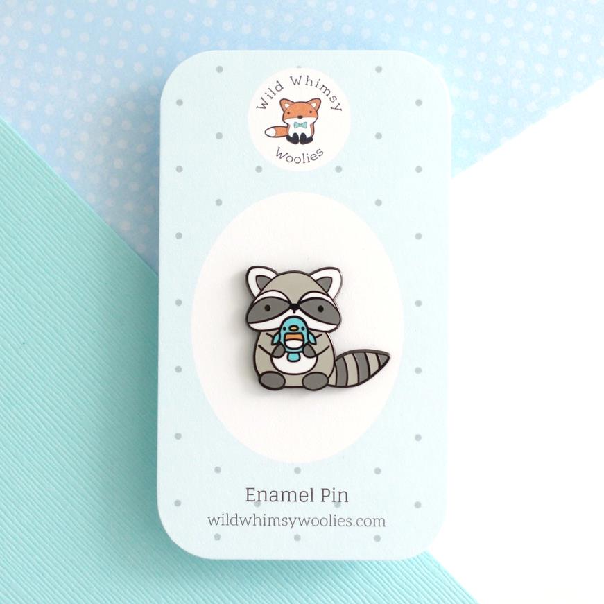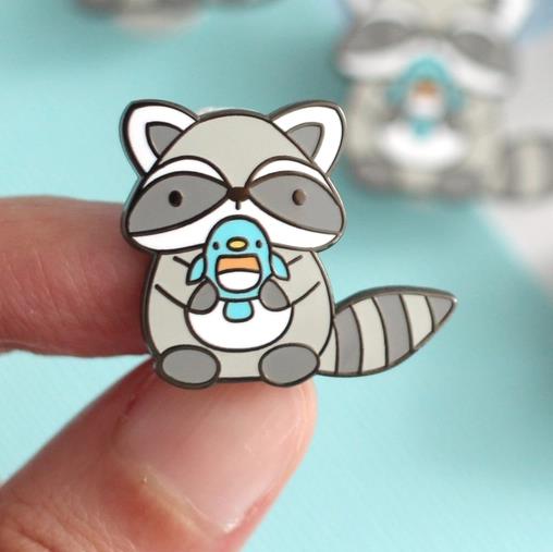 This cute raccoon holding a blue bird hard enamel pin is perfect for woodland animal lovers to customize tote bags, jackets, backpacks...